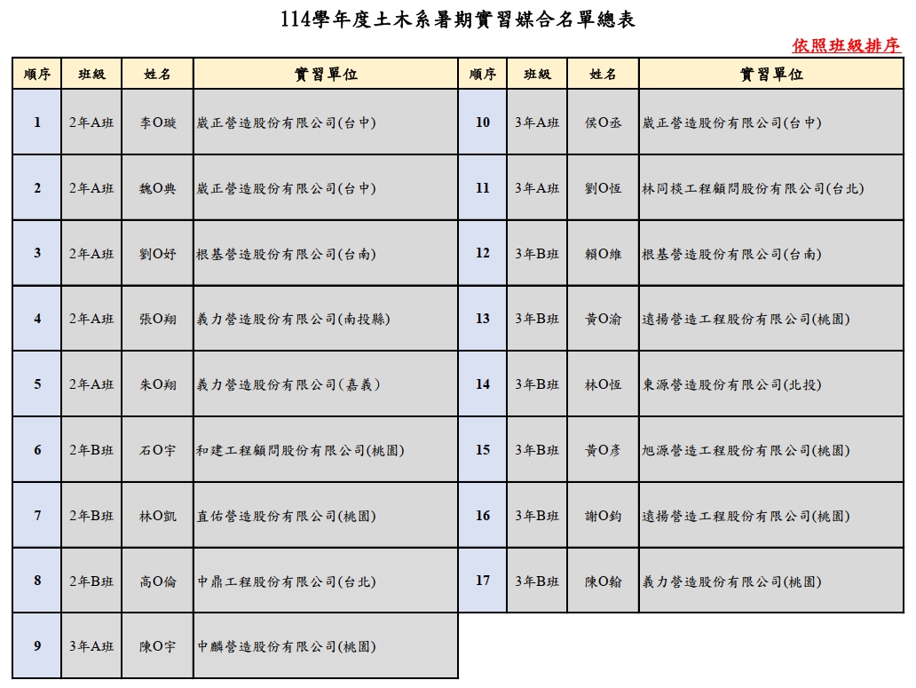 【實習公告】114學年度暑期實習媒合總表暨注意事項。2026年4月28日/在: 系辦公告以下媒合名單業經115年4月28日(建教推廣委員會議)審議結果。 ★注意事項: 1.實習行前說明會將另行於實習群組公布。 2.即日起至115年05月15日(星期五)前繳回【學生實習同意書】及【家長同意書】至助教室備查,如有不便亦可郵寄學校(桃園市中壢區中大路300號土木系-助教室 林匯祥 助教 收)。 新版實習學生同意書 家長同意書 /wp-content/uploads/2020/04/中央土木LOGO.png 0 0 ncucivil /wp-content/uploads/2020/04/中央土木LOGO.png ncucivil2026-04-28 14:09:332026-04-28 14:28:38【實習公告】114學年度暑期實習媒合總表暨注意事項。