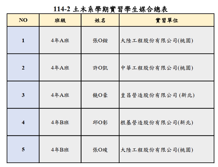 【實習公告】114-1學期實習媒合總表暨注意事項。2025年12月16日/在: 系辦公告以下媒合名單業經114年12月16日(建教推廣委員會議)審議結果。 ★注意事項: 1.實習行前說明會將另行於實習群組公布。 2.即日起至115年01月09日(星期五)前繳回【學生實習同意書】及【家長同意書】至助教室備查,如有不便亦可郵寄學校(桃園市中壢區中大路300號土木系-助教室 林匯祥 助教 收)。 新版實習學生同意書 家長同意書-2 /wp-content/uploads/2020/04/中央土木LOGO.png 0 0 ncucivil /wp-content/uploads/2020/04/中央土木LOGO.png ncucivil2025-12-16 15:21:262025-12-16 15:21:26【實習公告】114-1學期實習媒合總表暨注意事項。