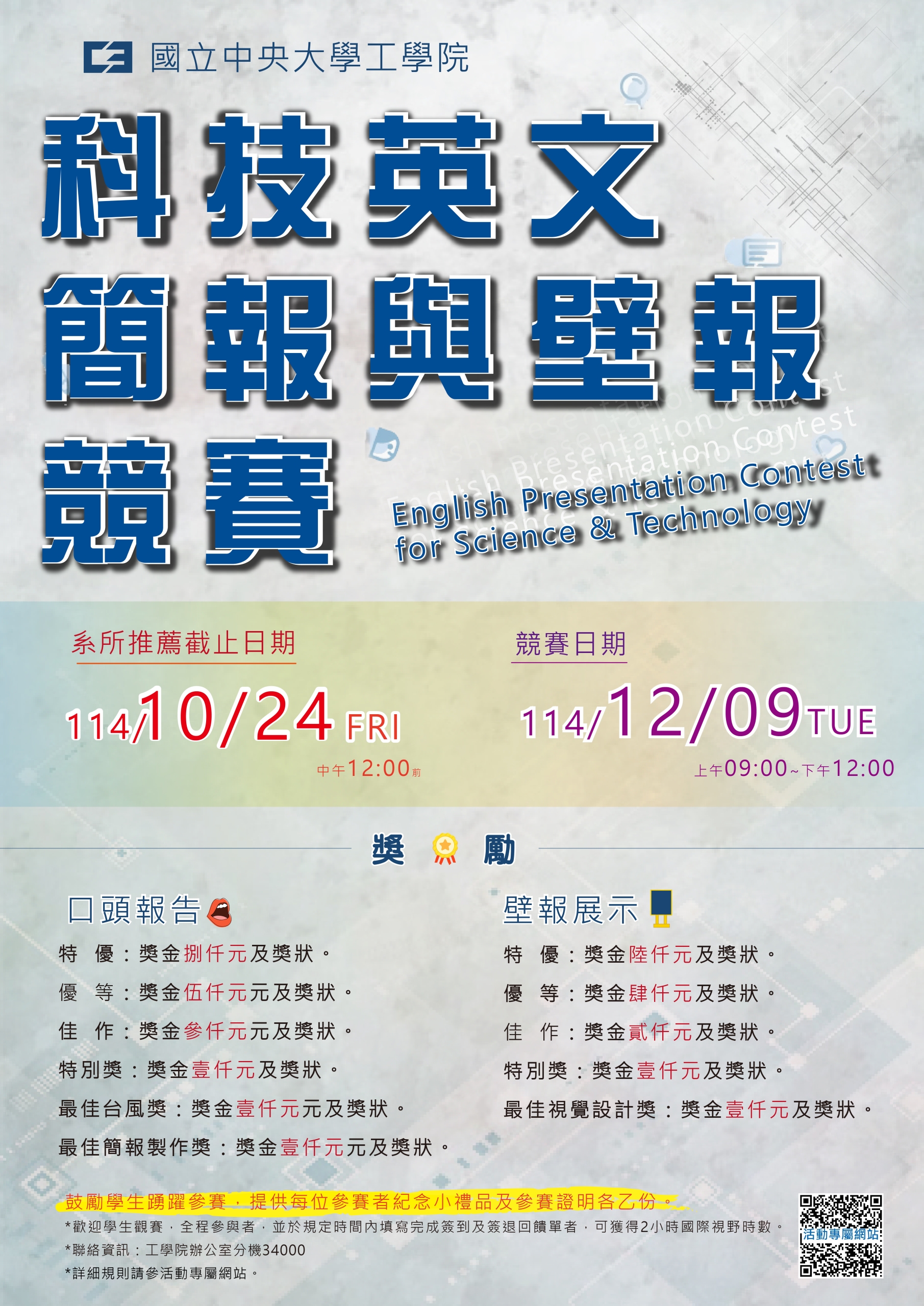 3. 參賽作品(壁報電子檔及英文簡說影片)繳交截止日:114年11月21日(五)中午12時前。