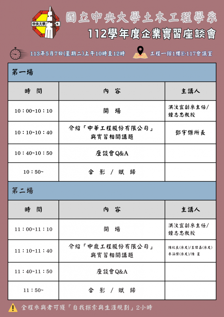 20240507企業說明暨實習座談會流程表2024年5月6日 /wp-content/uploads/2020/04/中央土木LOGO.png 0 0 ncucivil /wp-content/uploads/2020/04/中央土木LOGO.png ncucivil2024-05-06 14:36:472024-05-06 14:36:4720240507企業說明暨實習座談會流程表